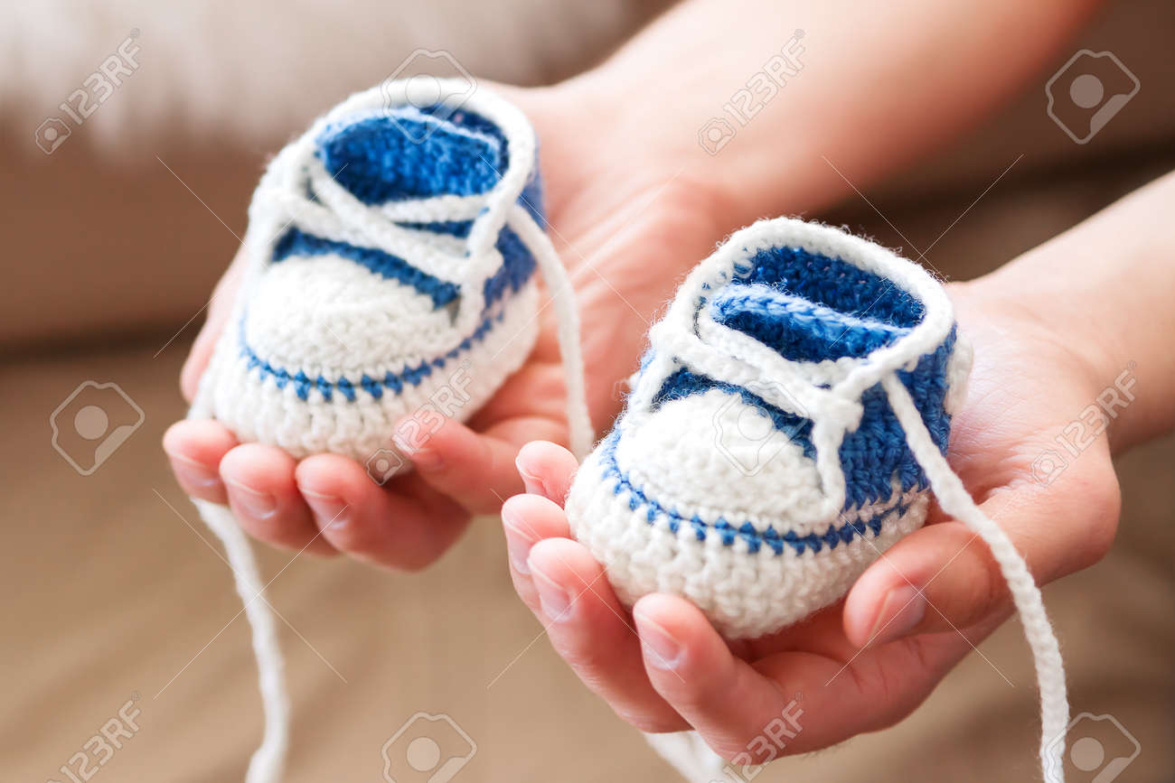 小さなベビー シューズ。Handknitted 男の子または女の子の最初のスニーカー。パパの手で手作り Bootees をかぎ針編み。新しく父はニットの靴をプレゼントします。の写真素材・画像素材Image 53550003。