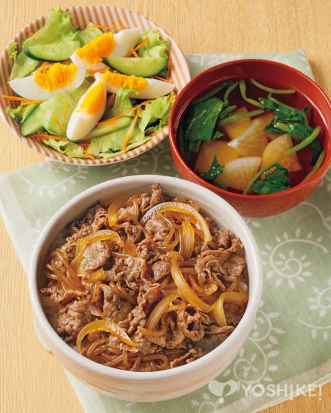牛丼 彩りたまごサラダすまし汁 食材宅配のヨシケイ 夕食ネット レシピ・メニュー・献立付き。