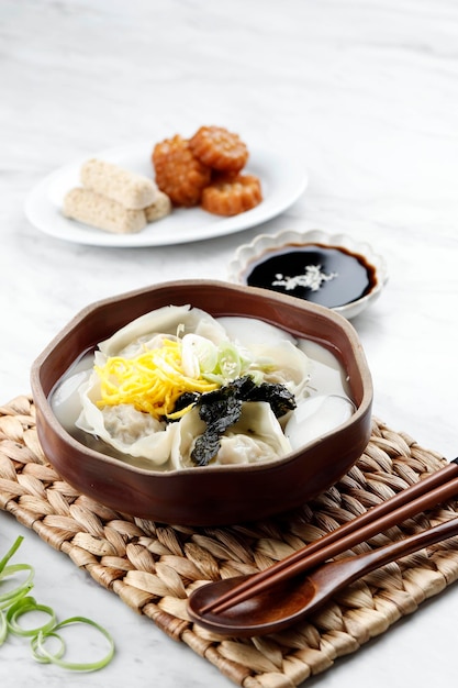 韓国の餃子とスライスした餅のスープ マンドゥ トックク お祝いの機会のための伝統的なスープPremium写真。