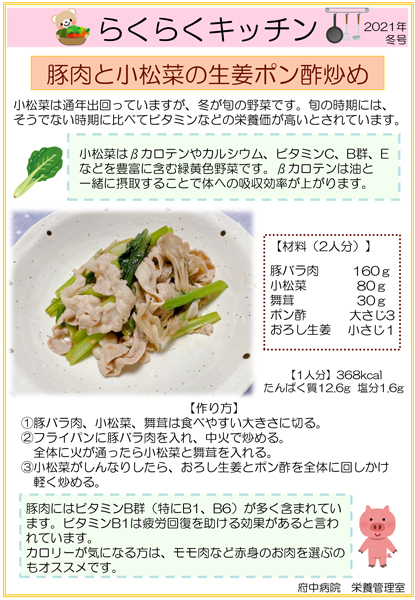 2021年冬号 「豚肉と小松菜の生姜ポン酢炒め」府中病院 社会医療法人 生長会。