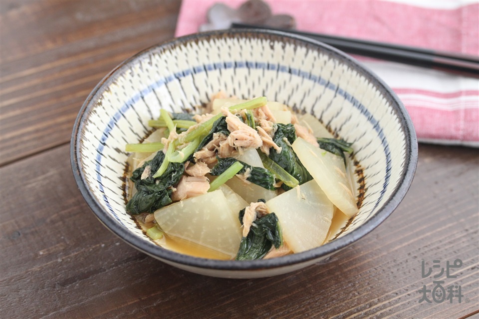 大根と小松菜とツナの煮物の献立 副菜:きのことレタスのシャキシャキサラダ仕立て、汁物:たんぱく質 が摂れる濃厚とろとろ豆腐ポタージュ 献立・メニュー 味の素パーク たべる楽しさを、もっと。