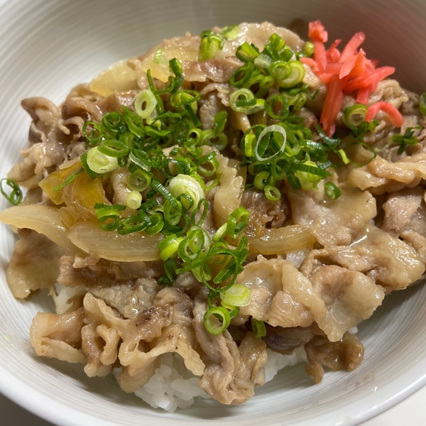 レシピ通りの豚丼 ①めんつゆ大さじ3、醤油大さじ3、水30cc、おろしにんにく小さじ2、はちみつ小さじ2を 合わせてタレを作っておく②フライパンにサラダ油を適量入れて、豚バラ200gを塩コショウ適量をふって炒める ③肉に火が通ったら、①のタレを入れて、豚肉を。