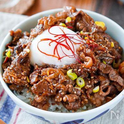 すきやき風 牛丼 作り方!甘辛い味付けに卵黄が最高に合う。