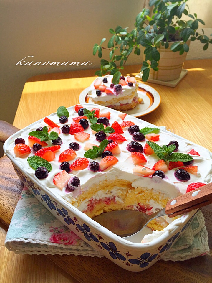 🍓🤍🍓🤍🍓🤍,簡単スコップケーキ , 🍓🤍🍓🤍🍓🤍, スポンジ→シロップ→生クリーム→果物→スポンジ、、,の順で繰り返し重ねただけのスコップケーキ!, 今回、シロップは冷凍ブルーベリーに, 砂糖ふりかけてチンして, ブレンダーしたものを使ったよ,缶詰のシロップでも可🙆♀️ , 適当に重ねて作っても、表面に粉糖かけとけば, それっぽく見えるのでお子さんとの, ケーキ作りにおすすめ🫶🤍,。