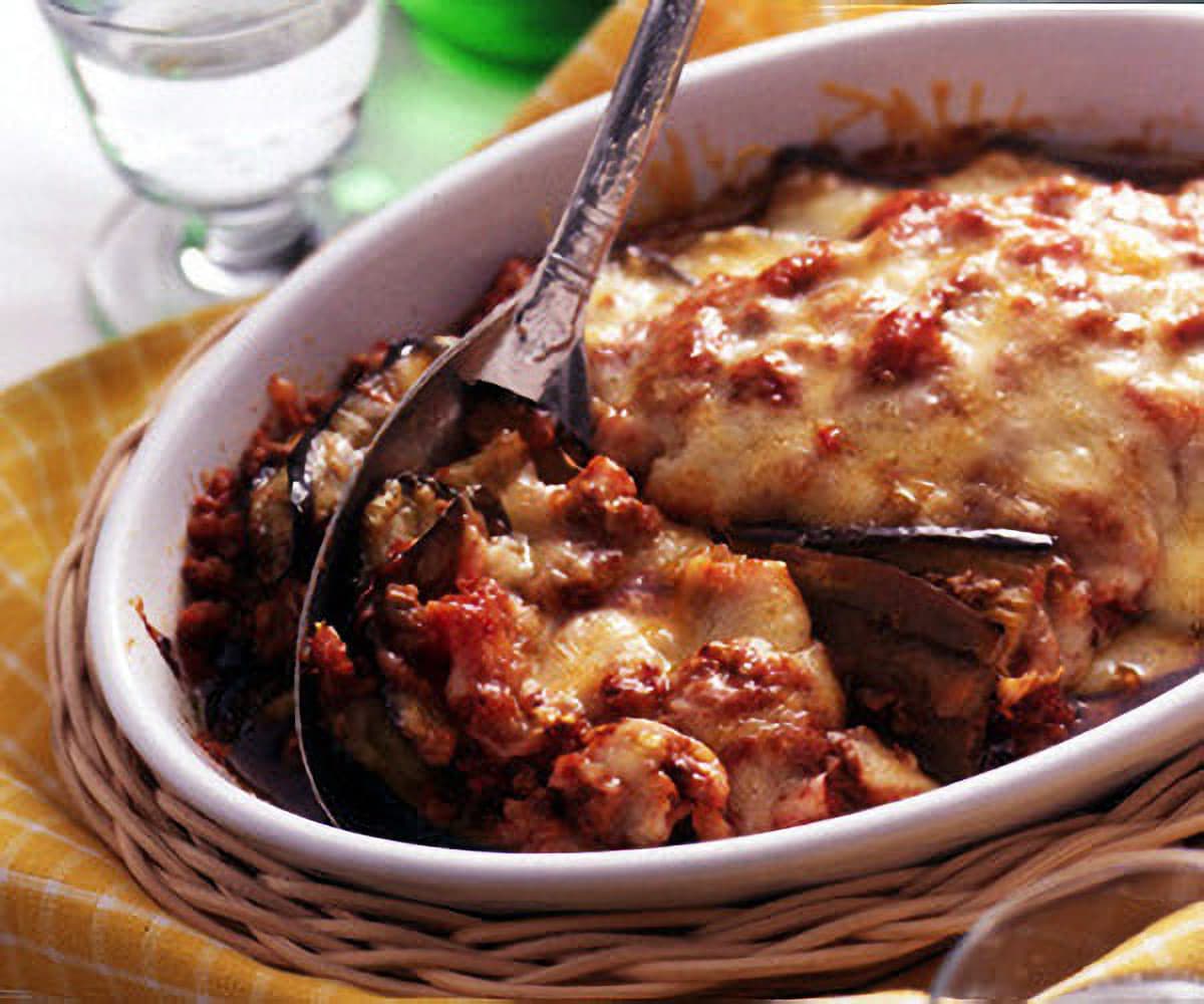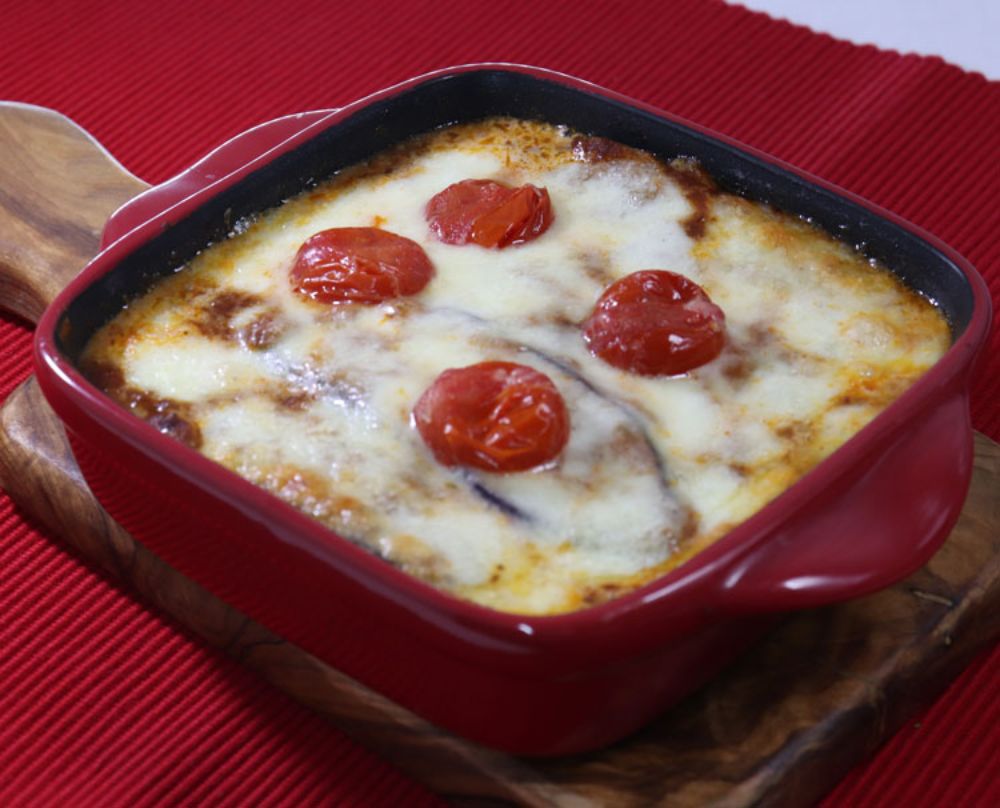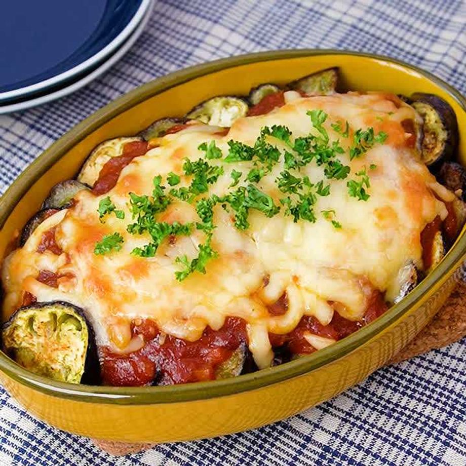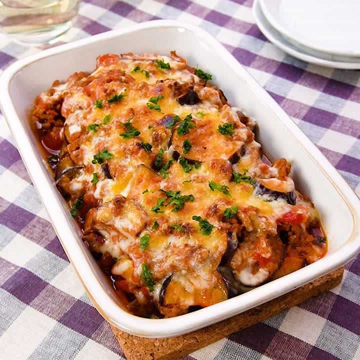 なすとミートソースの重ね焼きレシピナスとチーズを組み合わせた一皿。
