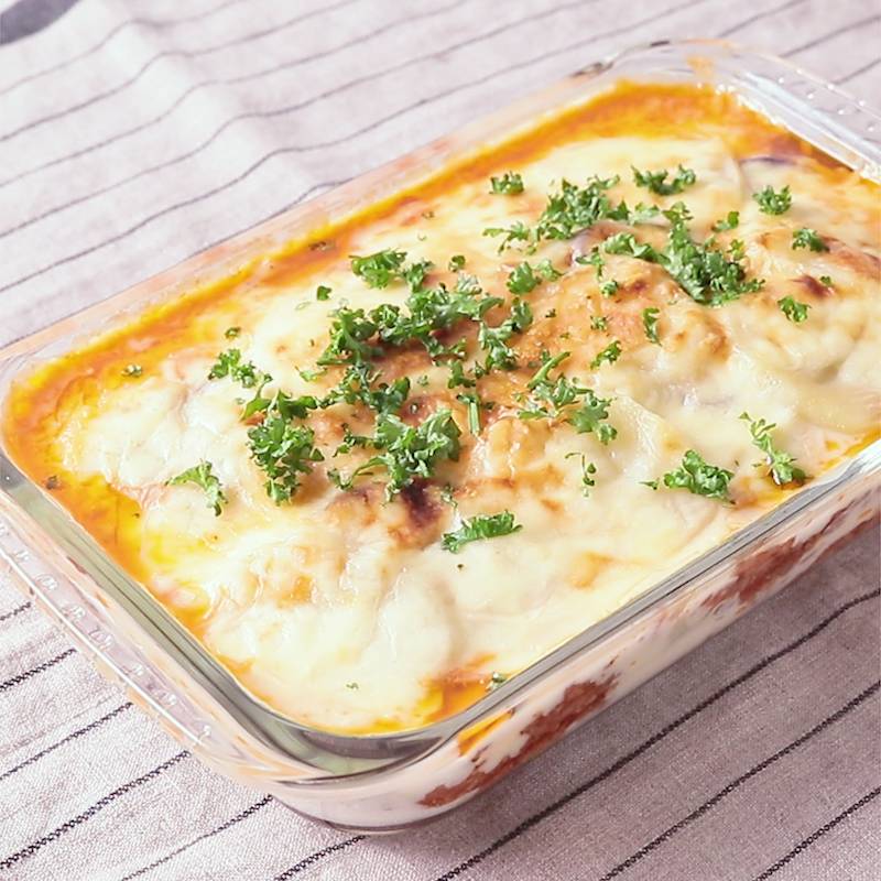 おうちで簡単 地中海風ナスとミートソースの重ね焼き。