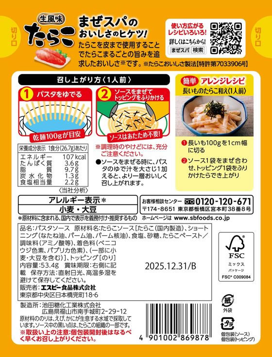 まぜるだけのスパゲッティソース 生風味たらこまぜるだけのスパゲッティソースエスビー食品株式会社。
