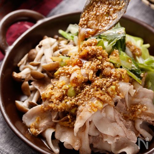 ごまポン酢ダレ 豚バラ肉とキャベツのフライパン蒸し。