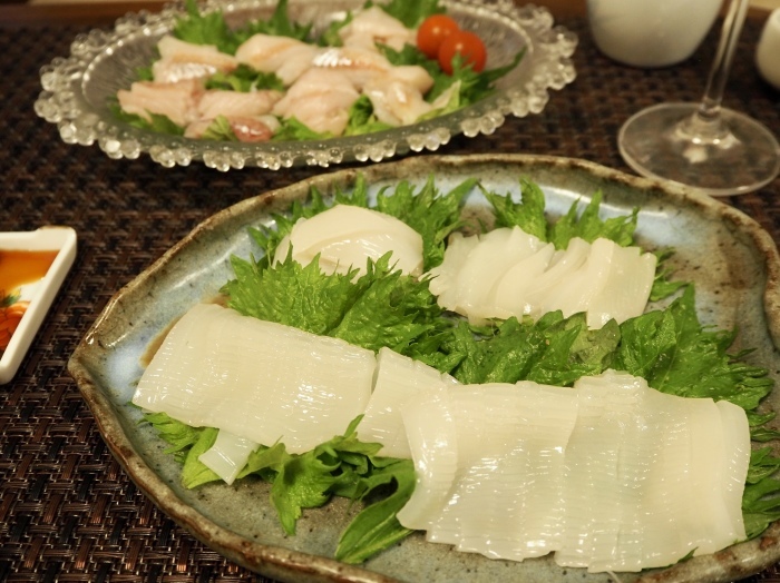 ピカピカしんせんスルメイカのお刺身ぜんしんづかい。