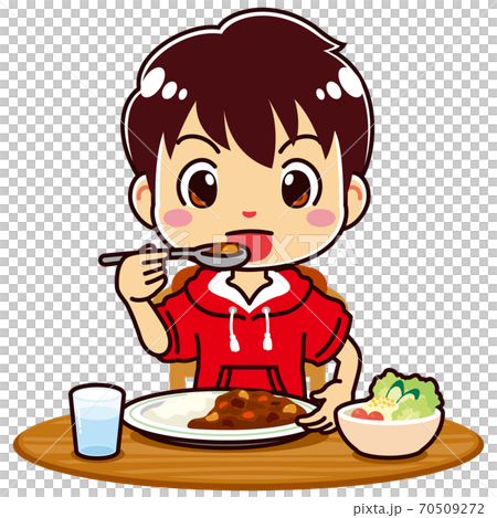 カレーとサラダを食べるパーカーの男の子のイラスト素材70509272- PIXTA。