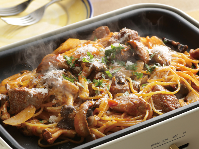 サイコロステーキときのこのパスタレシピピエトロ - 美味しいドレッシングとパスタを。