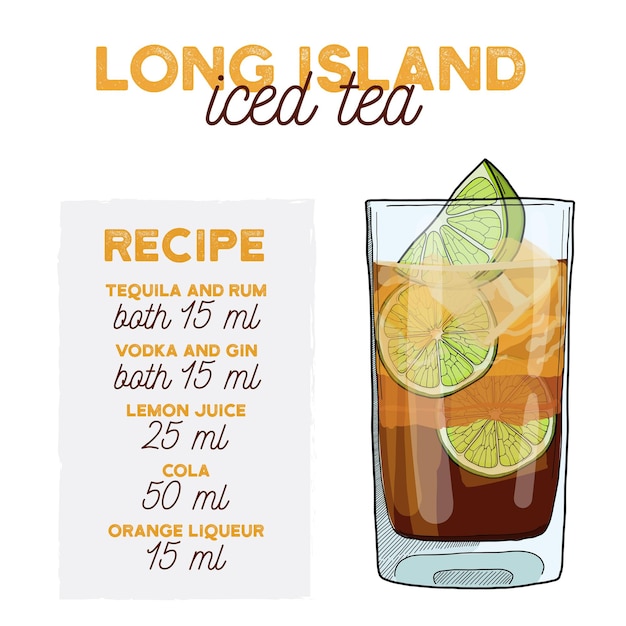 ロングアイランドアイスティーカクテルイラストレシピドリンクと材料Premiumベクトル素材。