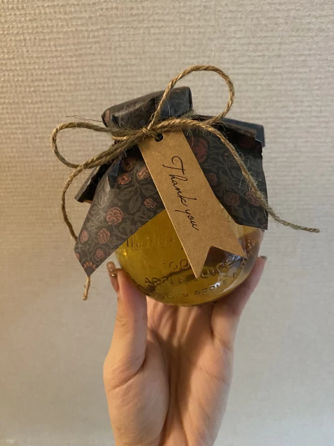 𓂃 プチギフト⌇マルティネリ 𓂃 𓈒𓏸✎ ' りんごジュース大好きなので迷わずマルティネリ🍎🫶🏻 いろいろ調べたけどコストコが最安値!紙じゃなくて布を巻いたのがこだわりポイント🤍紐はダイソー! 表はロゴをメインにデザインして、 裏はLitlinkに繋がるQRコードを。