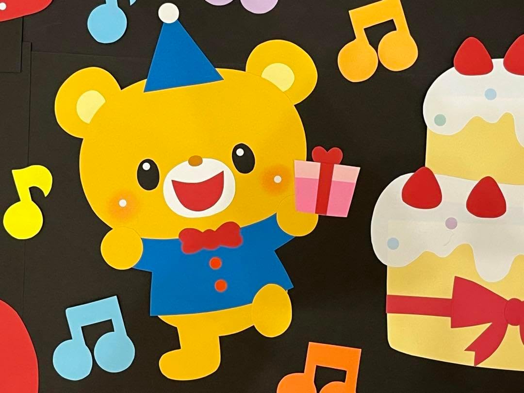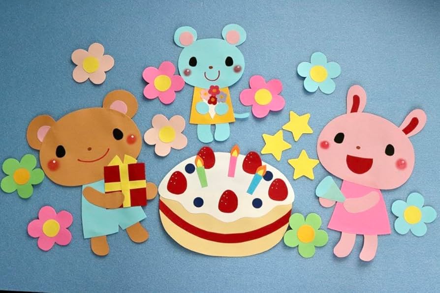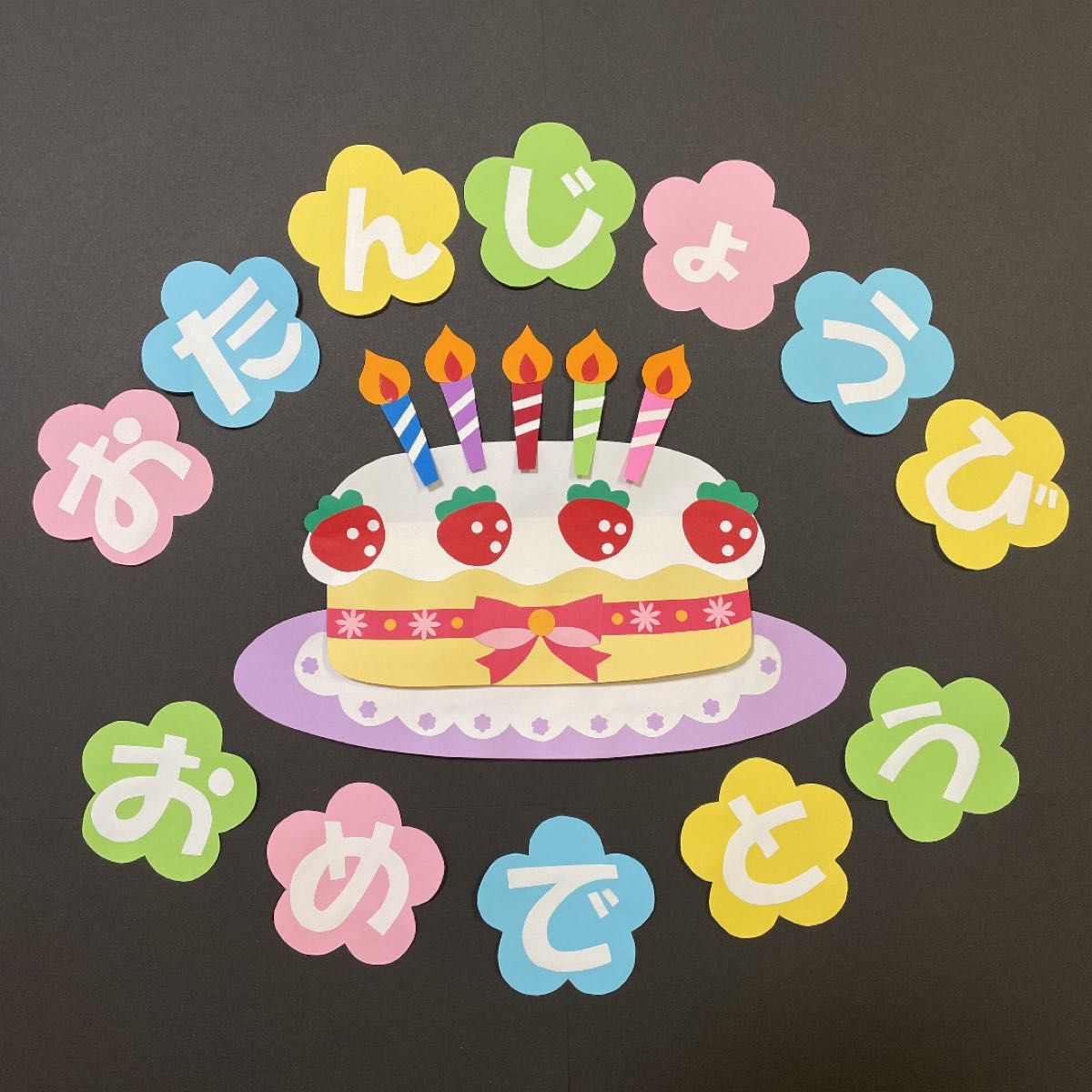 誕生日、ケーキ、お祝い、壁面飾り、パーティー、保育、小学校、介護施設、託児。