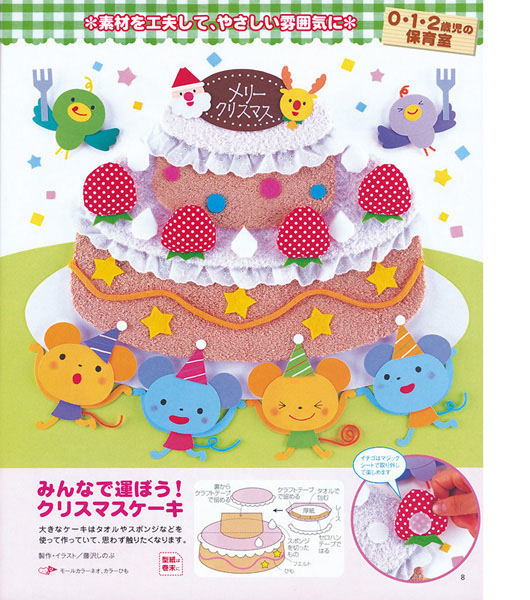 ケーキを囲んでメリークリスマス』 壁面飾り * 大きくて美味しそうなクリスマスケーキに大喜びの動物達🍓 窓からこっそり見守るサンタとトナカイが愛らしい 壁面飾りです🎄 「ラブリー壁面12か月」と「子どもの力が伸びる5歳児の保育12か月」 ナツメ社 に掲載して頂いて。