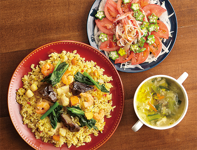 炊飯器でできるパエリア、さっぱりトマトサラダ、野菜スープイタリアンアレンジeフレンズ ぱくぱく献立くん。