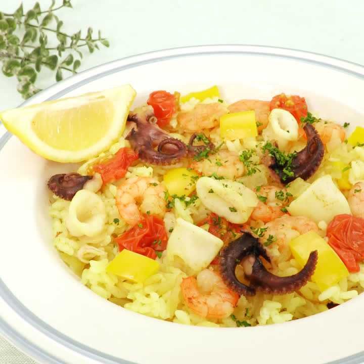 シーフードミックスでお手軽!炊飯器で作るパエリア風ピラフ。