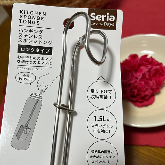 セリア の「スポンジトング」にロングタイプが登場!これで大きいボトルも底まで洗える。
