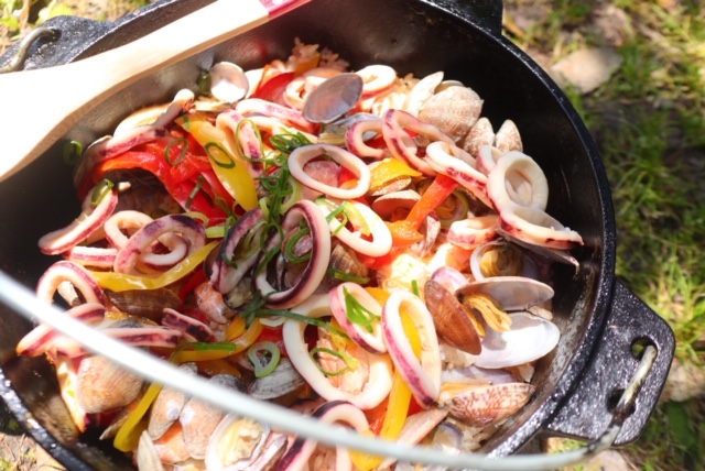 ダッチオーブンでパエリア 焚き火で鉄鍋料理。おこげが格別。魚介の旨みたっぷりのパエリア。