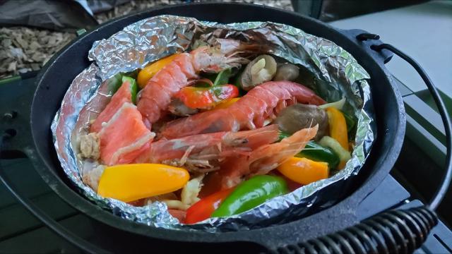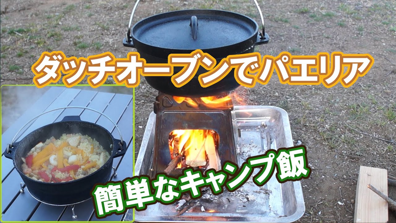 キャンプ飯 ダッチオーブンでシーフードパエリア - YouTube。