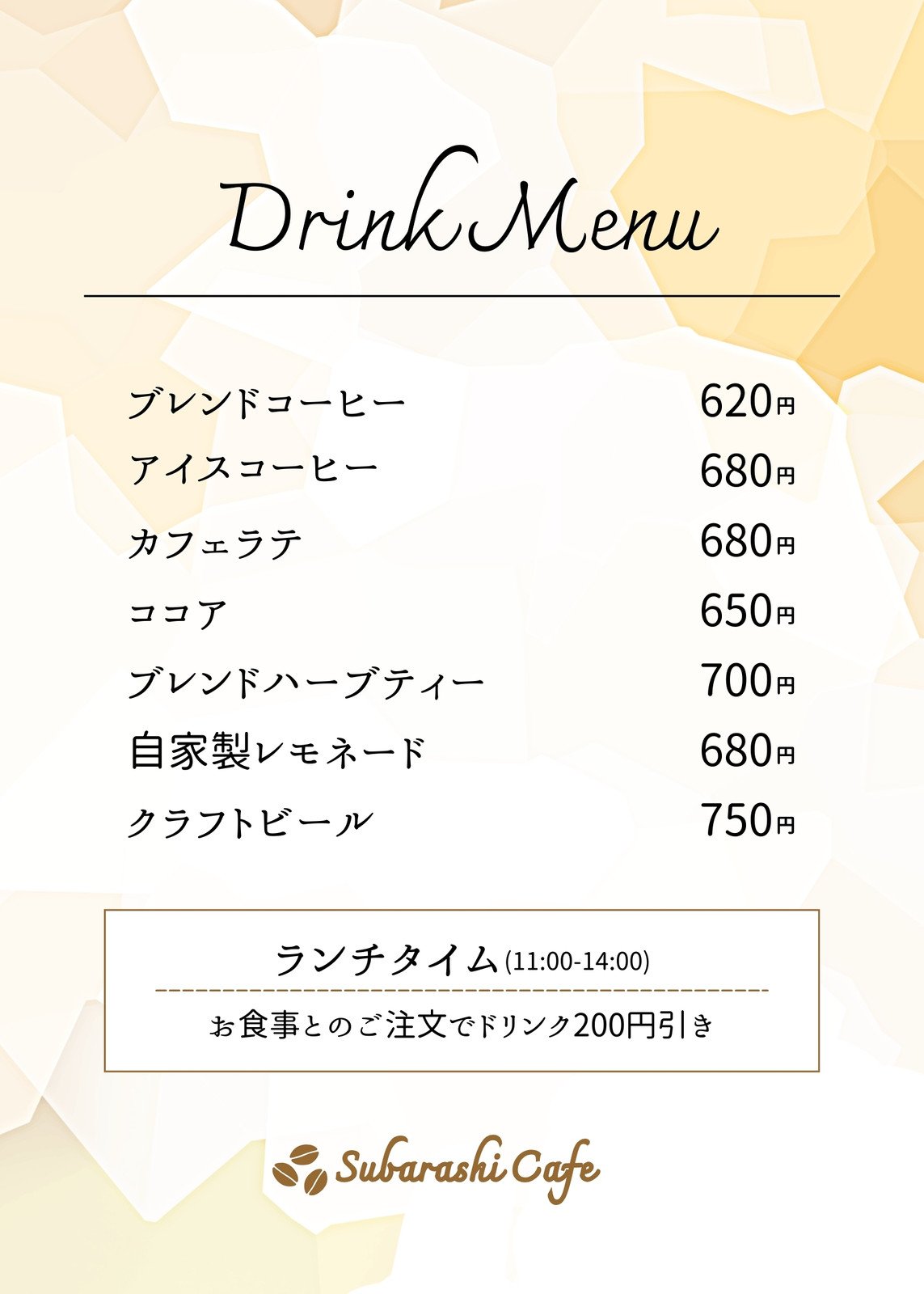 ドリンク 飲み物のメニュー表のデザインテンプレート・Word無料のビジネス書式テンプレート。