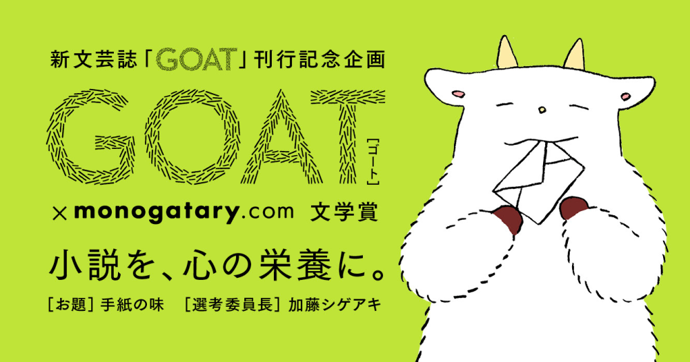 新文芸誌『GOAT』刊行記念企画 GOAT × monogatary.com 文学賞 募集開始!選考委員長に加藤シゲアキ氏を迎え、「モノコン2024」にて本日8月1日より作品を募集します。小説丸。