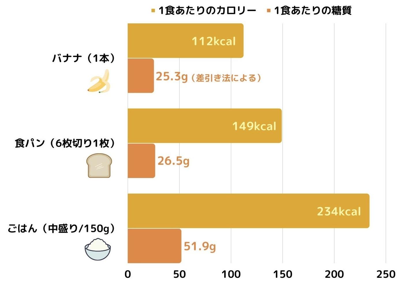 バナナは栄養豊富で甘いから高カロリー?? いいえ、1本およそ93kcalです!! 意外と知られていませんが、、 バナナのエネルギーは ・ご飯茶碗半分・6枚切りの食パン半分 何もつけないとほぼ同じカロリーになります♪ 朝食にバナナを食べると、夜に失われたビタミン。