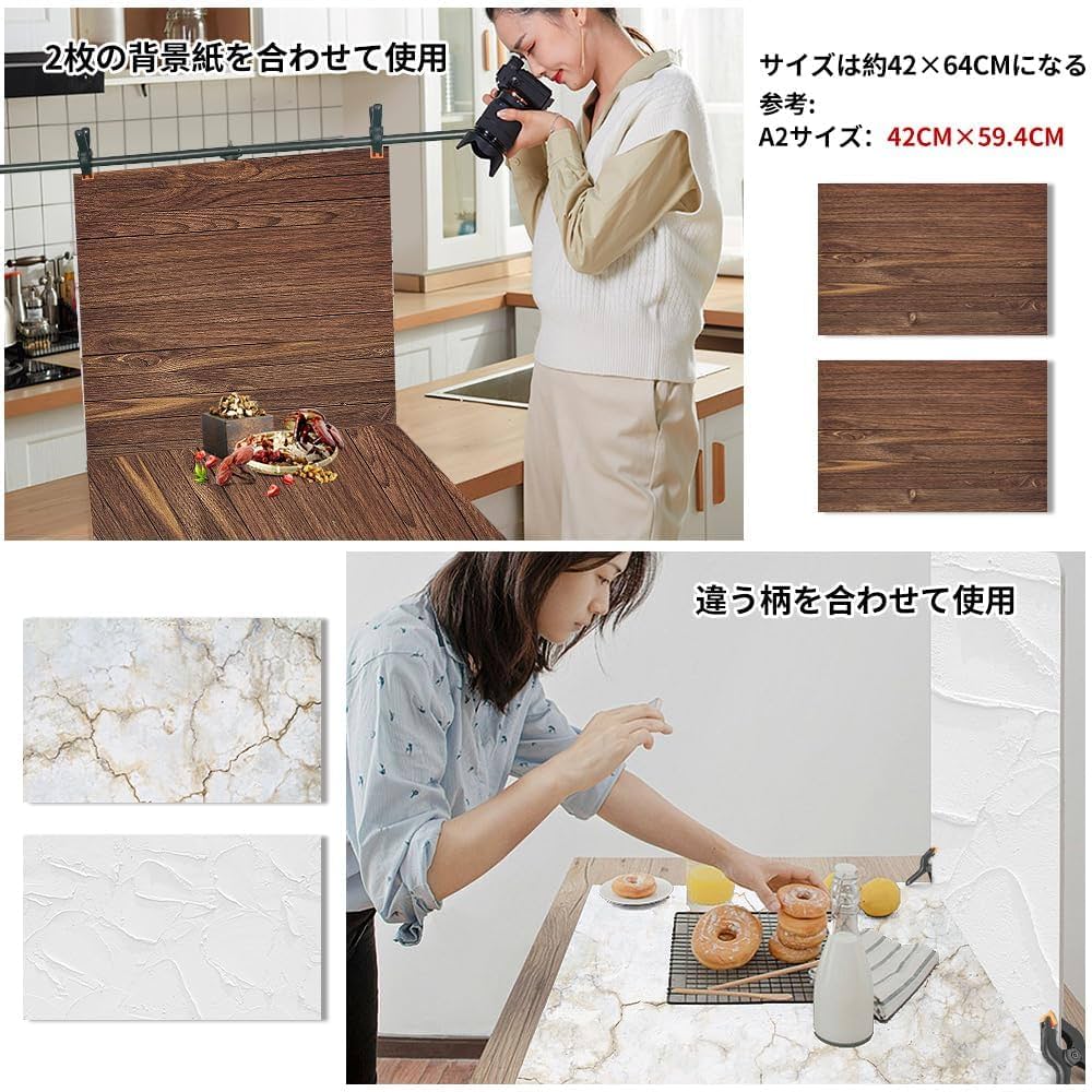 Amazon背景シート 撮影用 大理石 写真撮影背景紙 木目 両面 バックペーパー フォトスタイリング 57*87CM 防水 背景紙 厚い 背景布背景ボード スタジオ背景 インスタ映え 小物 商品撮影 自宅 雑誌 料理 美食 アクセサリー撮影など適合 撮影道具4バックペーパー。