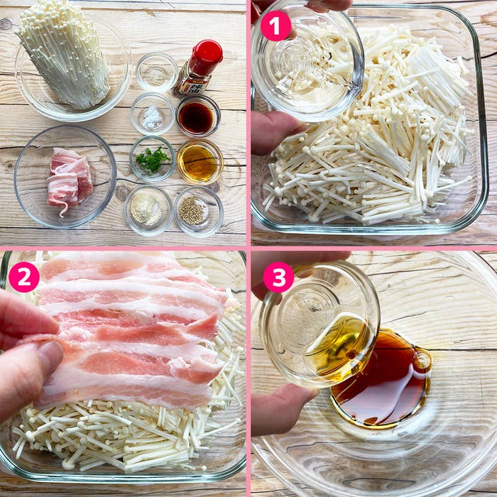 簡単レシピ: レンジで作るうま辛だれの豚巻きえのき。