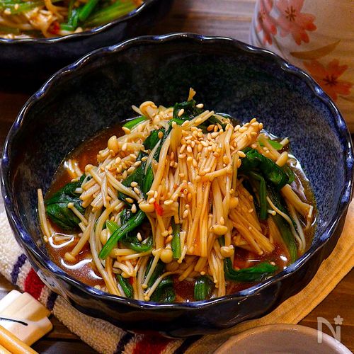 レンジで10分!! えのきとほうれん草のピリ辛和え。