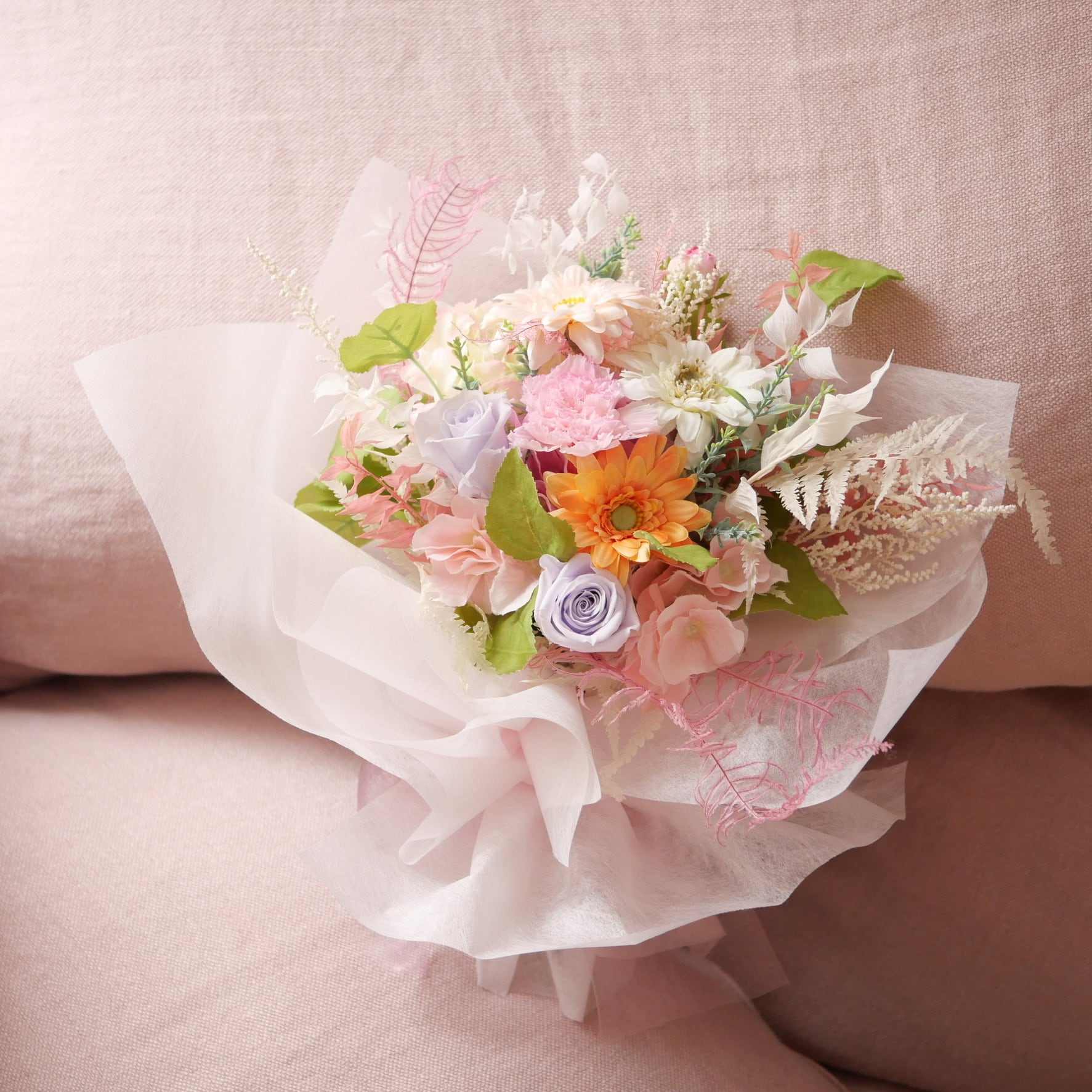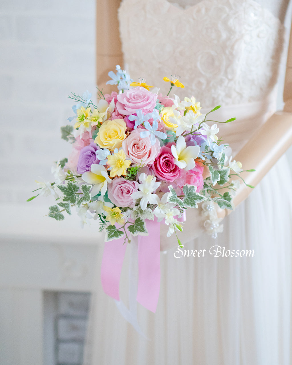 NB005 パステルカラフルな花束造花&プリザーブドフラワーのウェディングブーケやギフトのことなら フラワースタジオノエル。