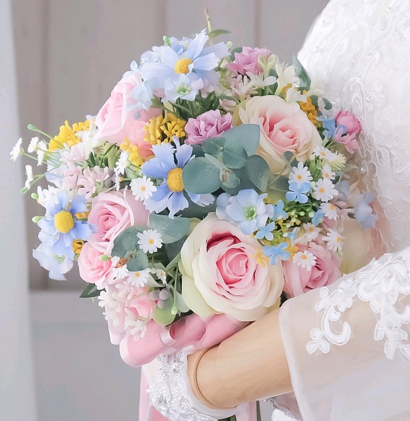パステルカラーブーケ 造花ブーケ ブライダルブーケ 結婚式 花嫁 ウエディングブーケ 前撮り 花束 フォト。