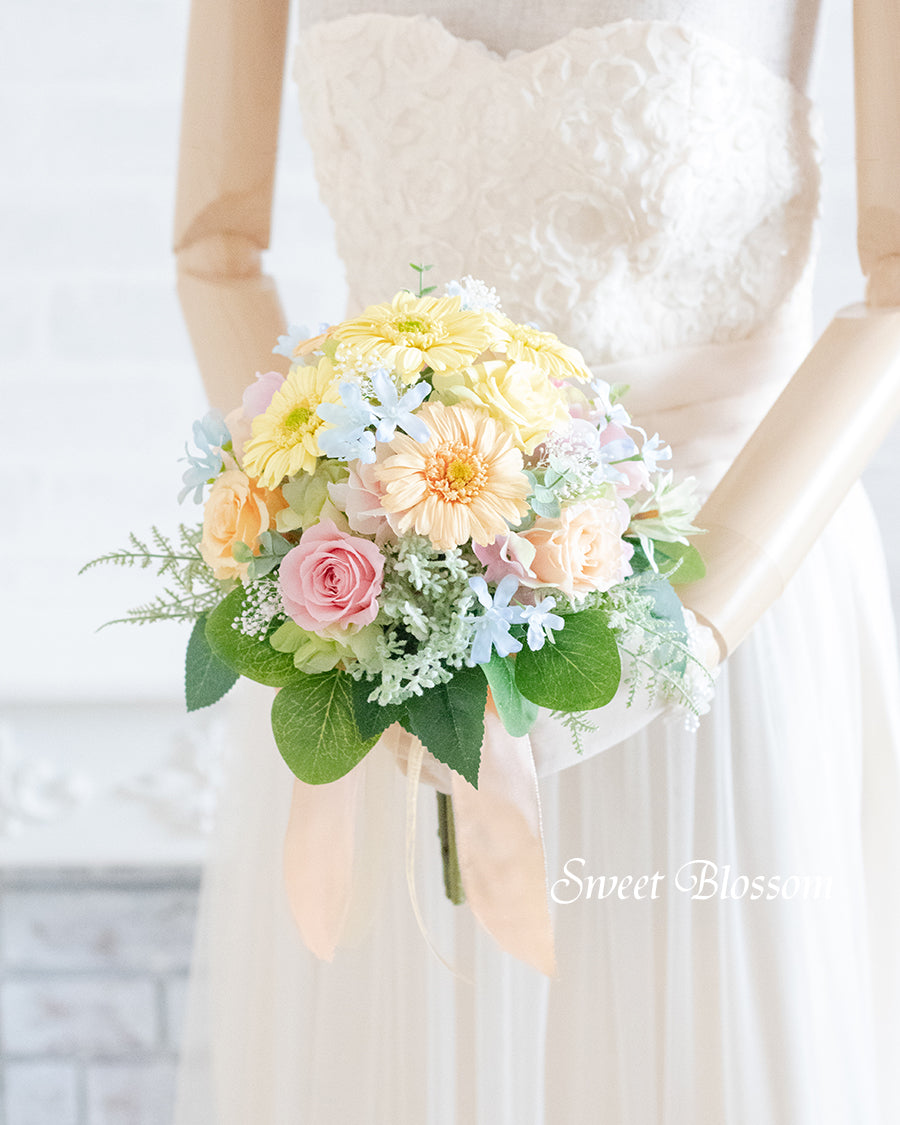 パステルカラーのガーベラとバラのナチュラルブーケ ブリザーブドフラワーのウェディングブーケ– Sweet Blossom。