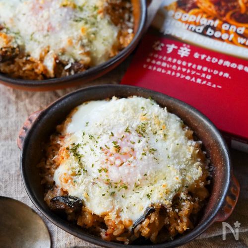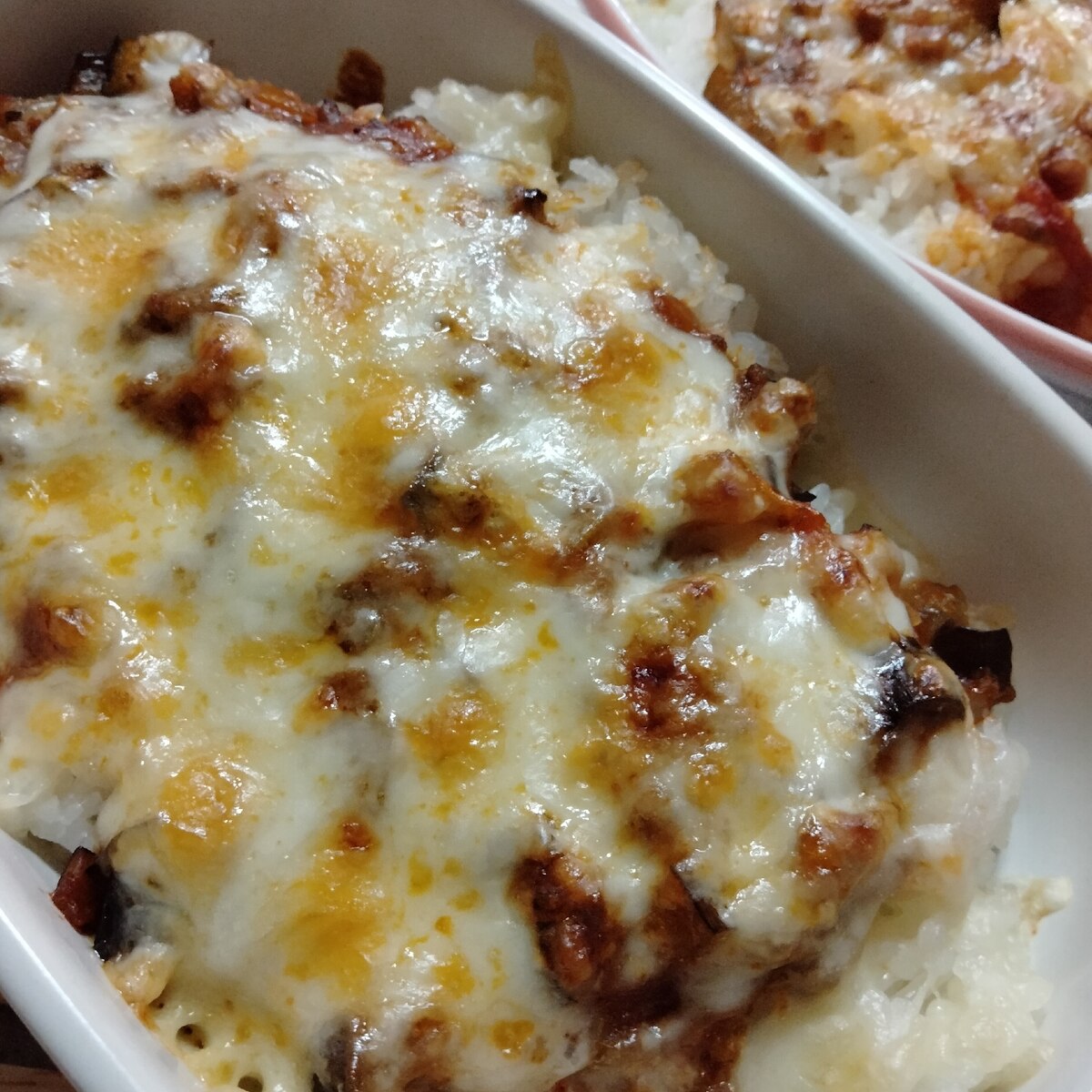 パスタソースで簡単に!なすとひき肉のピリ辛ドリア。