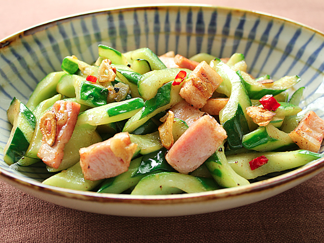 きゅうりとベーコンのオリーブオイル炒めOlive Oil Life オリーブオイルライフ。