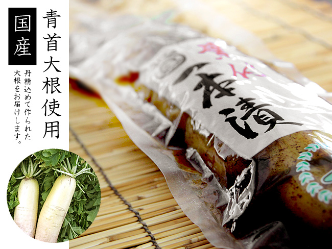 葉付一本漬 国産だいこん使用安全安心有機肥料使用 化学肥料不使用 の大根です。ソフトな歯ざわりと甘味のある仕上げで食卓に健康と真心を提供しています。