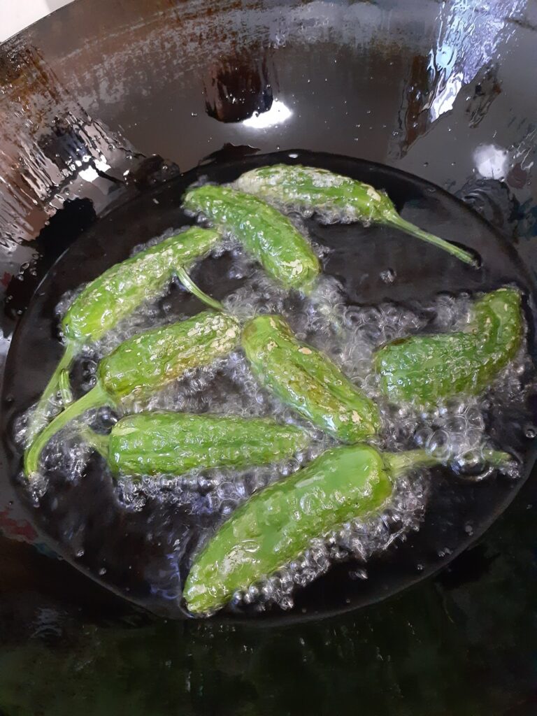 スペインガリシア料理パドロンを伊豆の甘唐辛子、ピーマン、シシトウで再現。肉厚の甘唐辛子が一番現地に近いね。 padrongalicianfood。