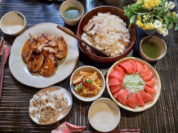 簡単!焼き鯛の香りと旨味たっぷり鯛めし!箸休めは、旬のたけのこの旨煮。