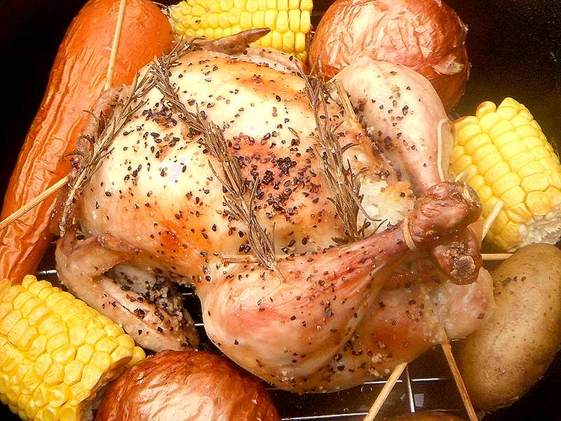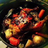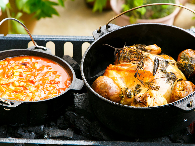 「ダッチオーブンで焼く、丸鶏のローストチキン」。