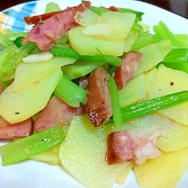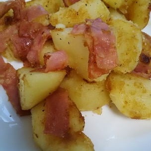 厚切りハムとジャガイモのにんにく炒め。