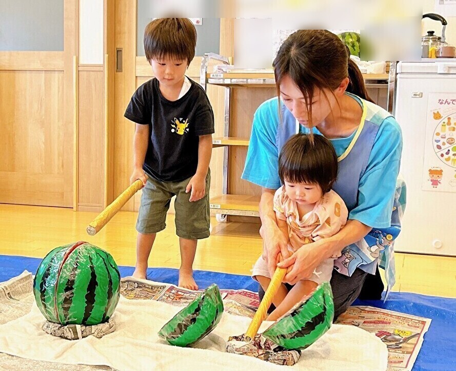 スイカ割りで夏気分!松江おひさま保育園社会福祉法人えどがわ。
