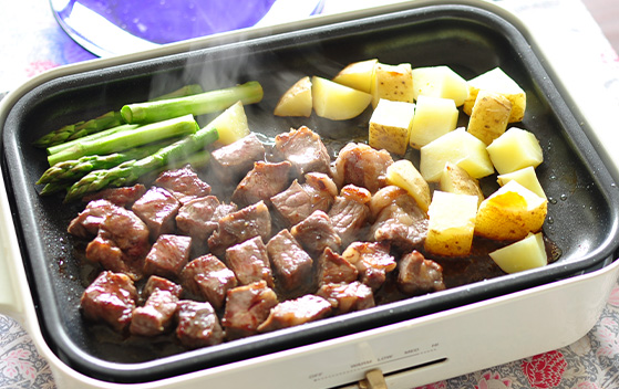 優れだし」ホットプレートでビーフステーキレシピ 優レシピ株式会社シマヤ。