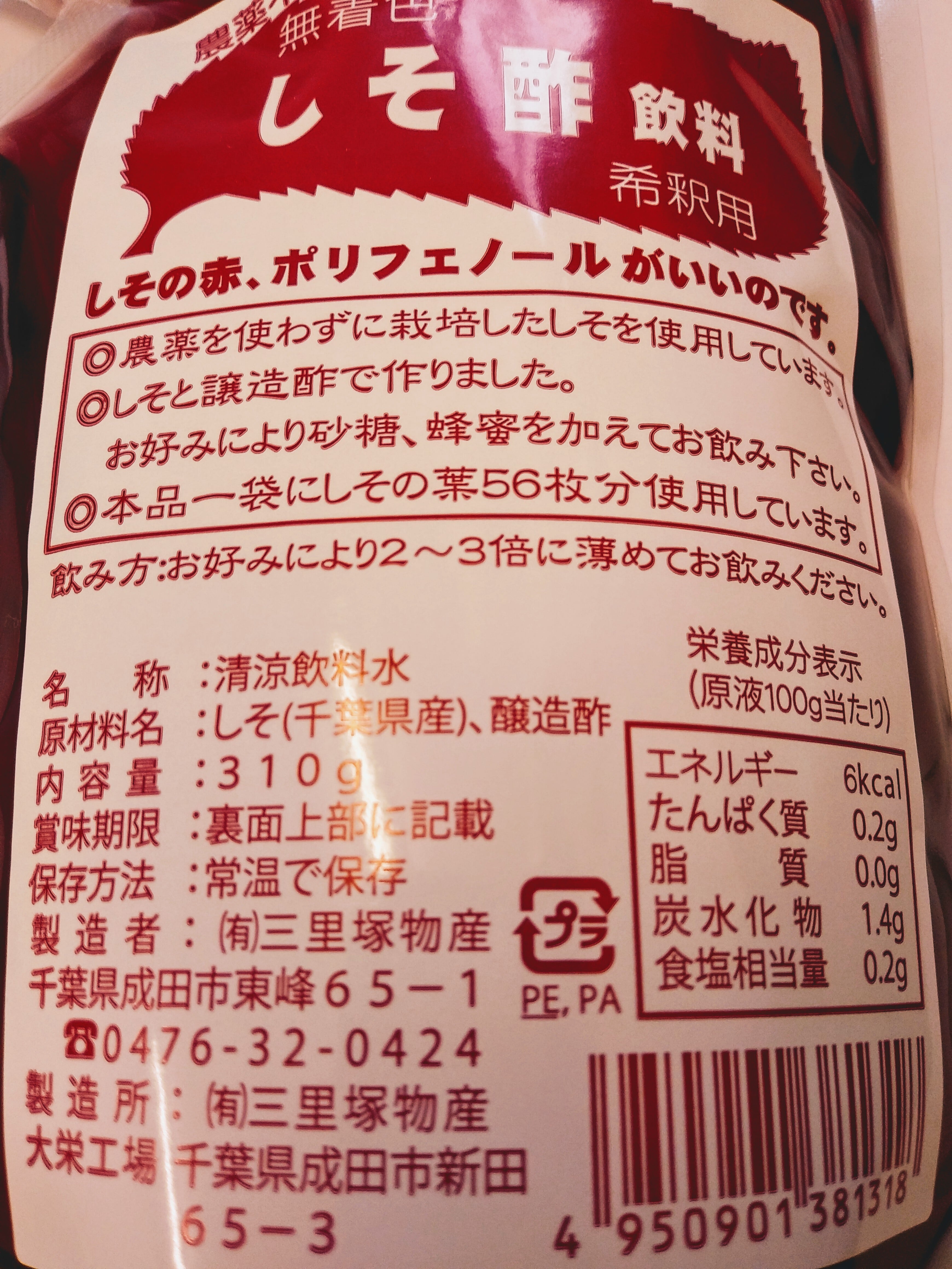 農薬不使用栽培 しそ酢飲料 希釈用310g 砂糖不使用三里塚物産のWEBショップ。