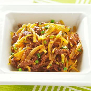 牛肉こま切れと大根玉ねぎの甘辛味噌炒め。