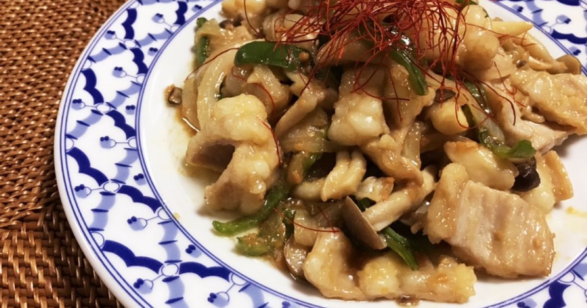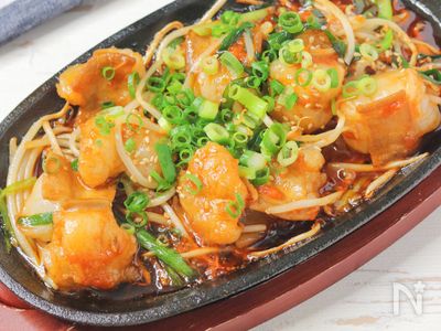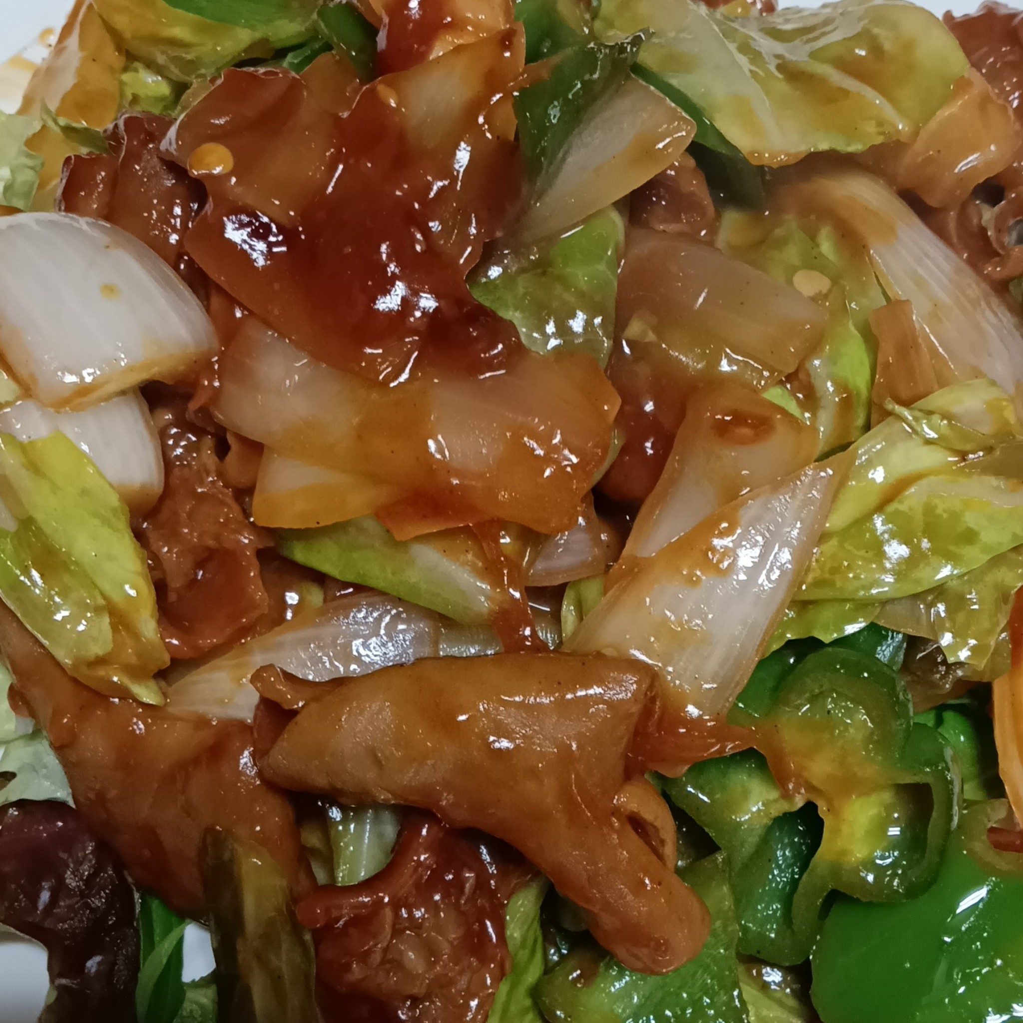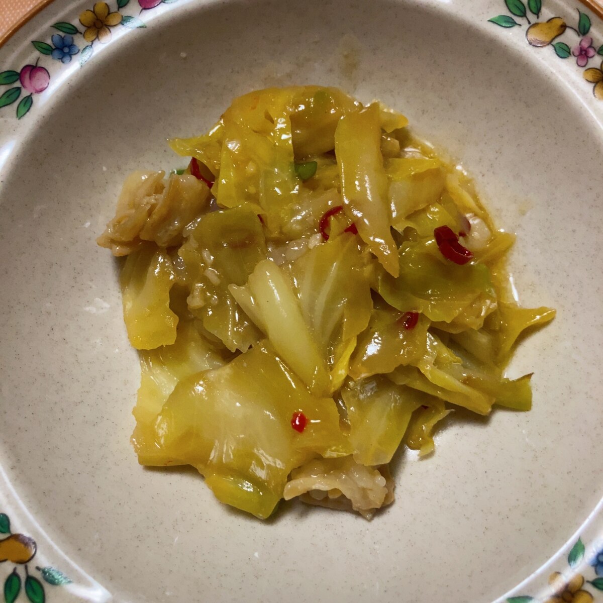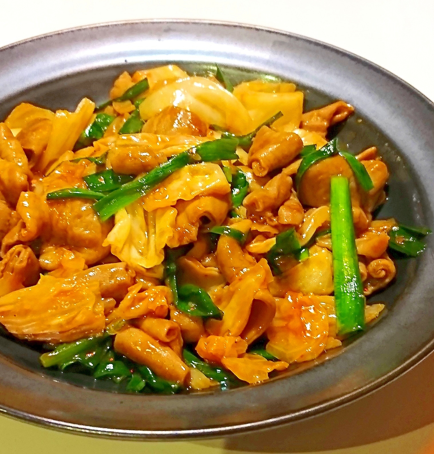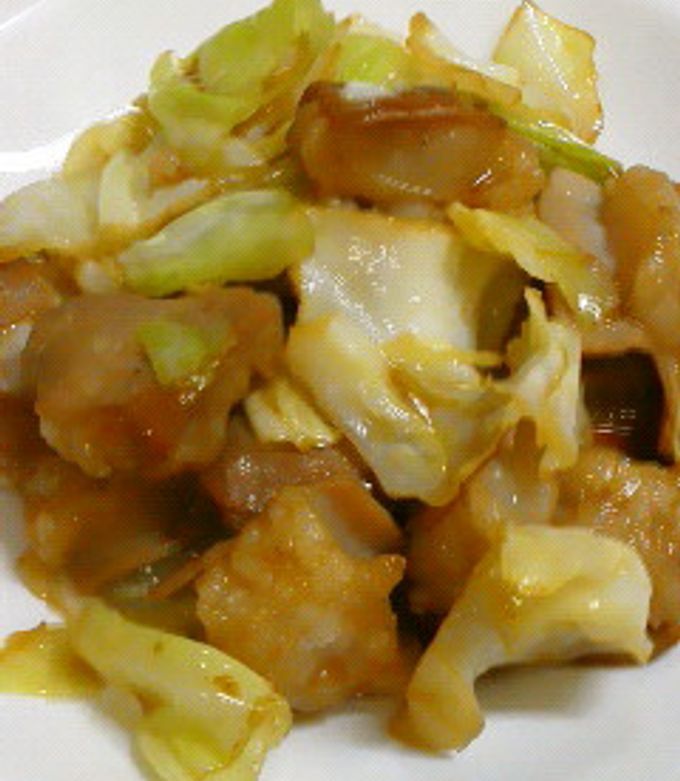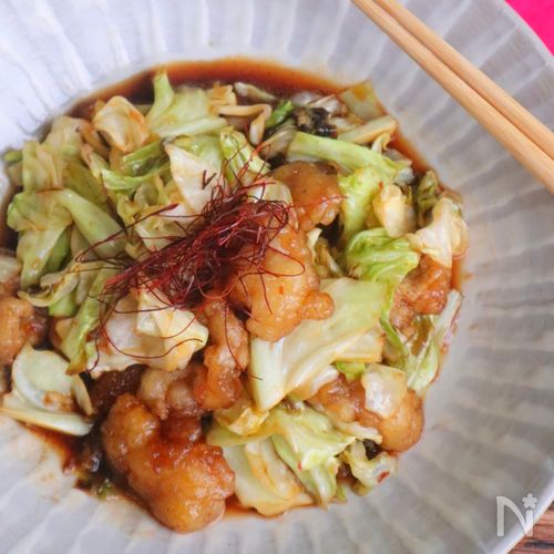 \ぷりぷり 揚げホルモンとキャベツのピリ辛甘酢炒め。