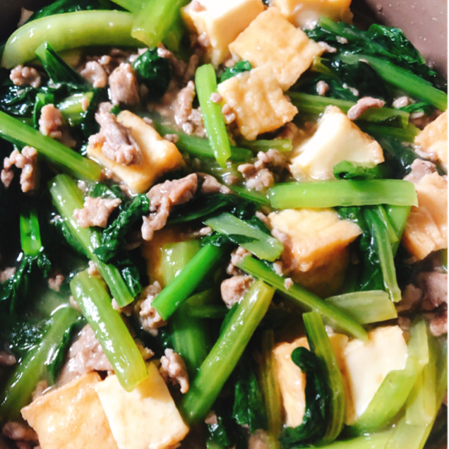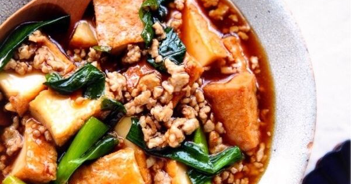 厚揚げと小松菜の和風そぼろ煮 とろ〜り♡しょうが香る♪。