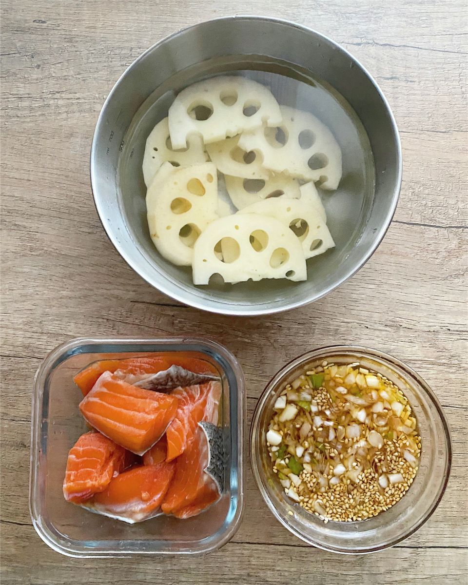 「鮭とれんこんの焼きびたし」レシピ!鷹の爪でピリッと辛く。