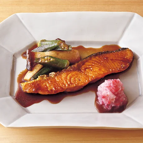 サーモンのめんつゆ照り焼き梅おろし添え。