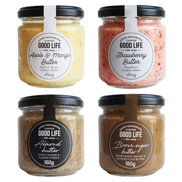 幸せのフルーツバター お楽しみセット いちごバター+アップル&マンゴーバター+アーモンドバター+黒糖きな粉くるみバター各1個のセット幸せのフルーツバター - グッドネイバーズコーヒ。