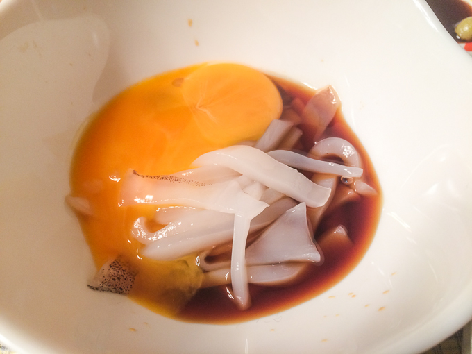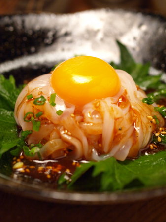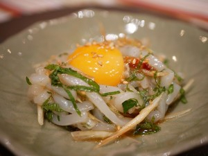 柚子胡椒入り卵黄醤油の剣先イカユッケ。